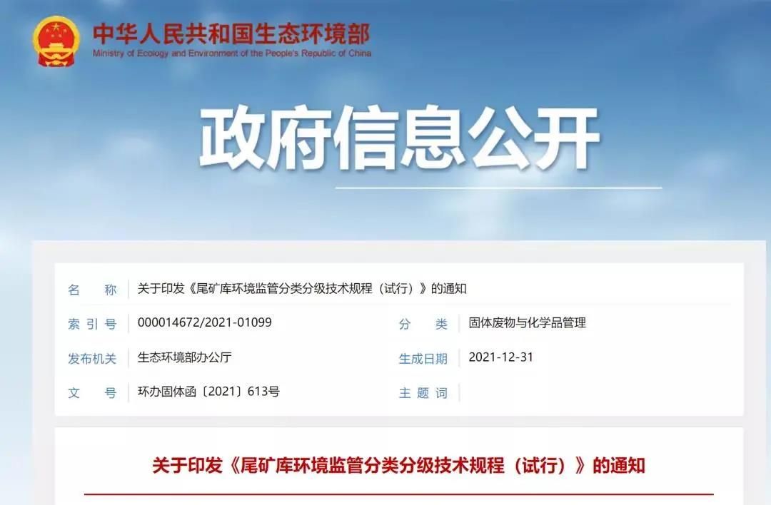 近日,生態(tài)環(huán)保部網(wǎng)站公布關(guān)于引發(fā)《尾款庫環(huán)境保護(hù)分類分級(jí)技術(shù)規(guī)程(試行)》的通知。根據(jù)通知《尾款庫環(huán)境保護(hù)分類分級(jí)技術(shù)規(guī)程(試行)》,該技術(shù)規(guī)程于2021年12月31日生成。這是尾款庫監(jiān)督管理方面極其重要的一項(xiàng)新的技術(shù)規(guī)程。