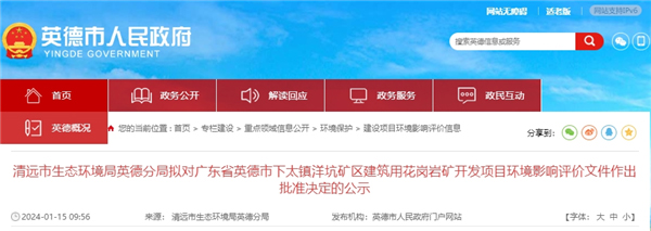 1月15日,廣東省清遠市生態(tài)環(huán)境局英德分局發(fā)布下太鎮(zhèn)洋坑礦區(qū)建筑用花崗巖礦開發(fā)項目環(huán)境影響評價文件擬批準決定的公示。該項目總投資30.1億元,生產(chǎn)規(guī)模400萬方/年,平均年產(chǎn)碎石448.93萬方、機制砂203.96萬方。